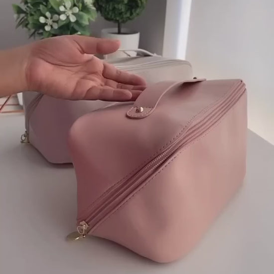 Storage: The open bag is shown holding several items, including small jars, bottles, a tube of product, and what appears to be a foundation bottle, highlighting its utility for storing a full range of beauty essentials.