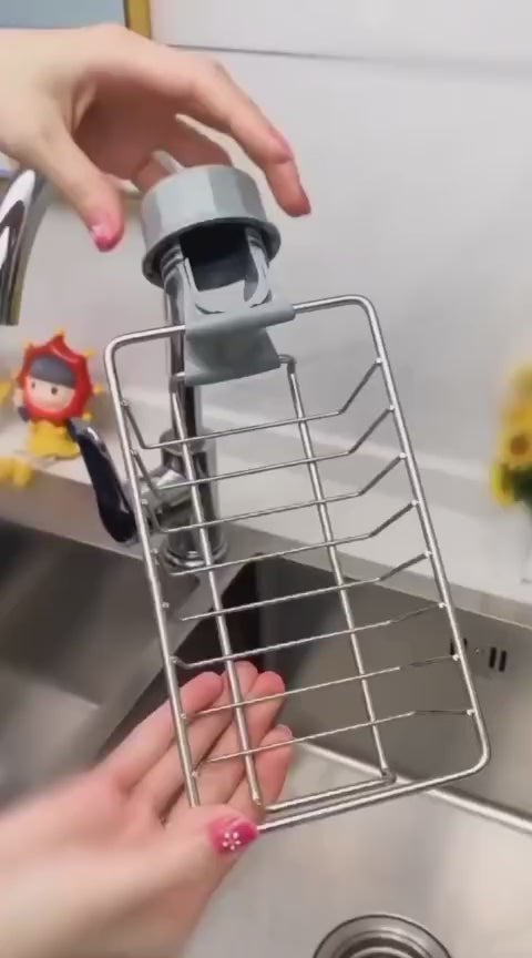 Attachment/Installation: The key feature is the snap-on or clamp mechanism at the back. It is designed to be easily installed and adjusted by tightening it onto the vertical pipe (neck) of a kitchen or bathroom faucet (tap). This installation is drill-free and keeps the caddy elevated and off the countertop.
