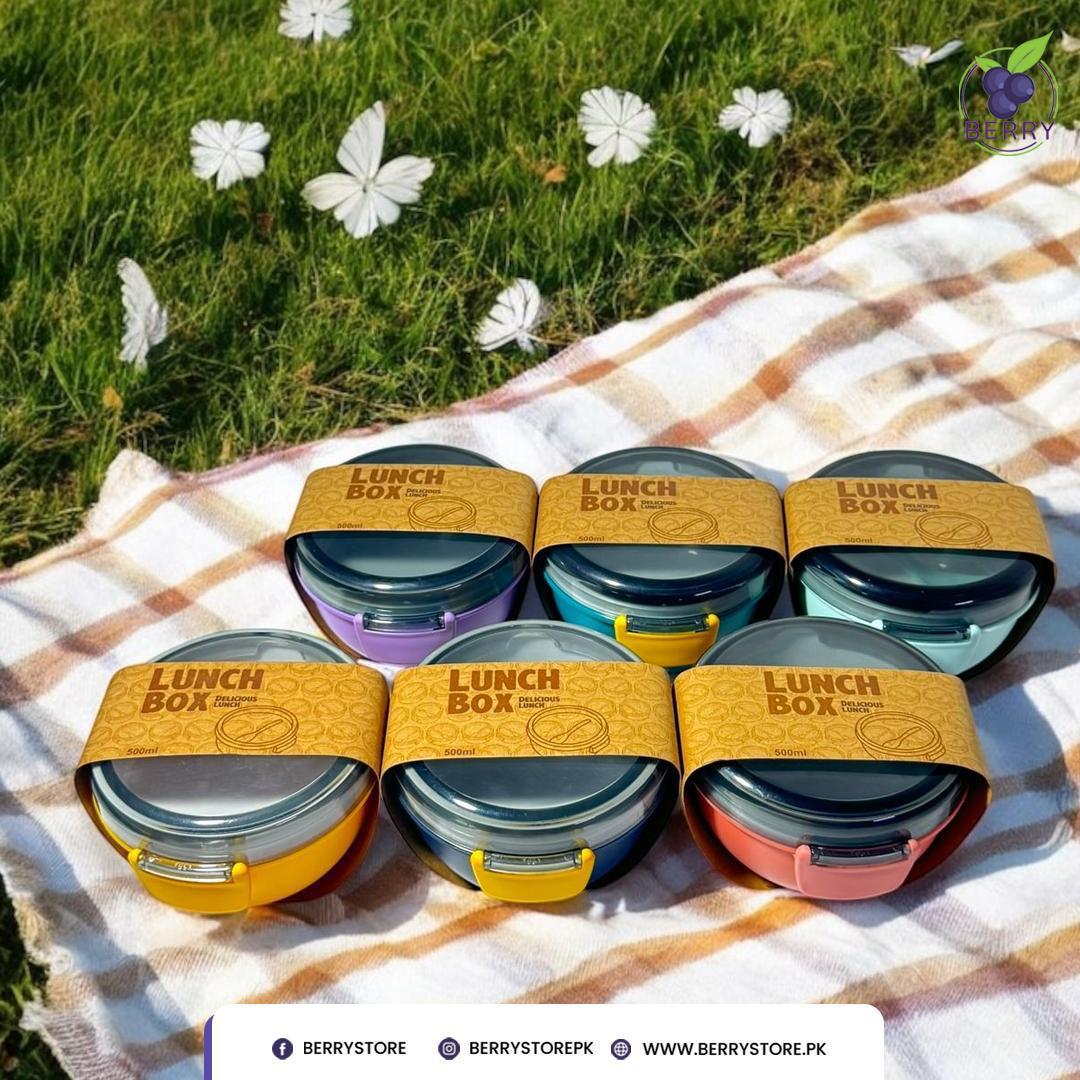 Packaging: Each container is secured with a wide, mustard-yellow paper band that says "LUNCH BOX" and features a repeating logo pattern. The band also highlights the "500ml" capacity.